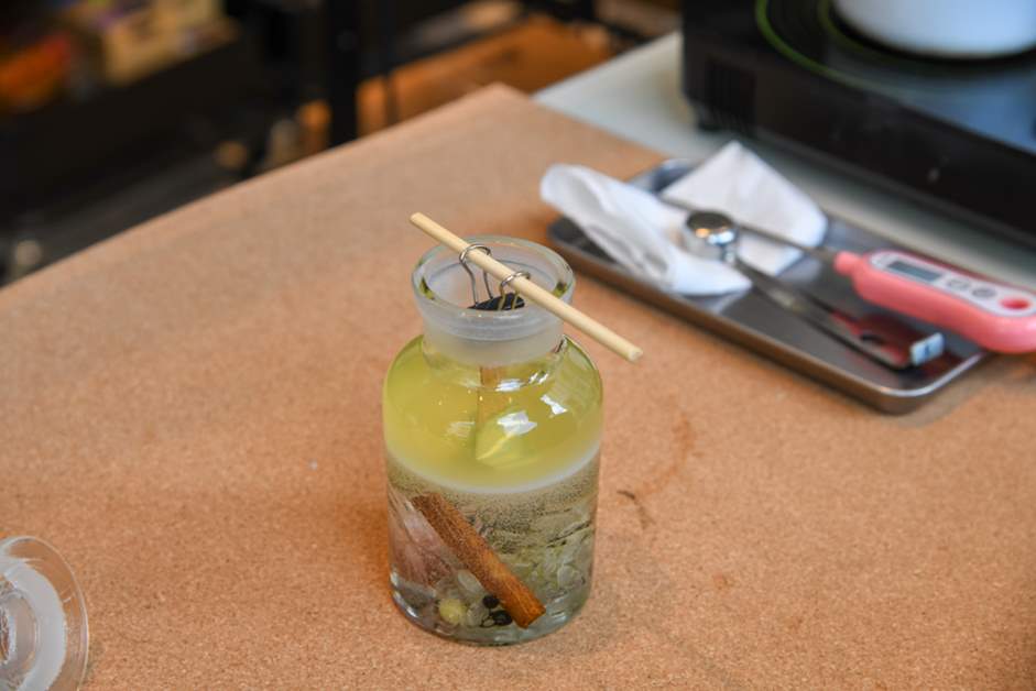 接下来利用果冻蜡到凝固的时间制作带芳香的大豆蜡。说起芳香,从天然的到人造的有30个种类以上的很丰富的种类。