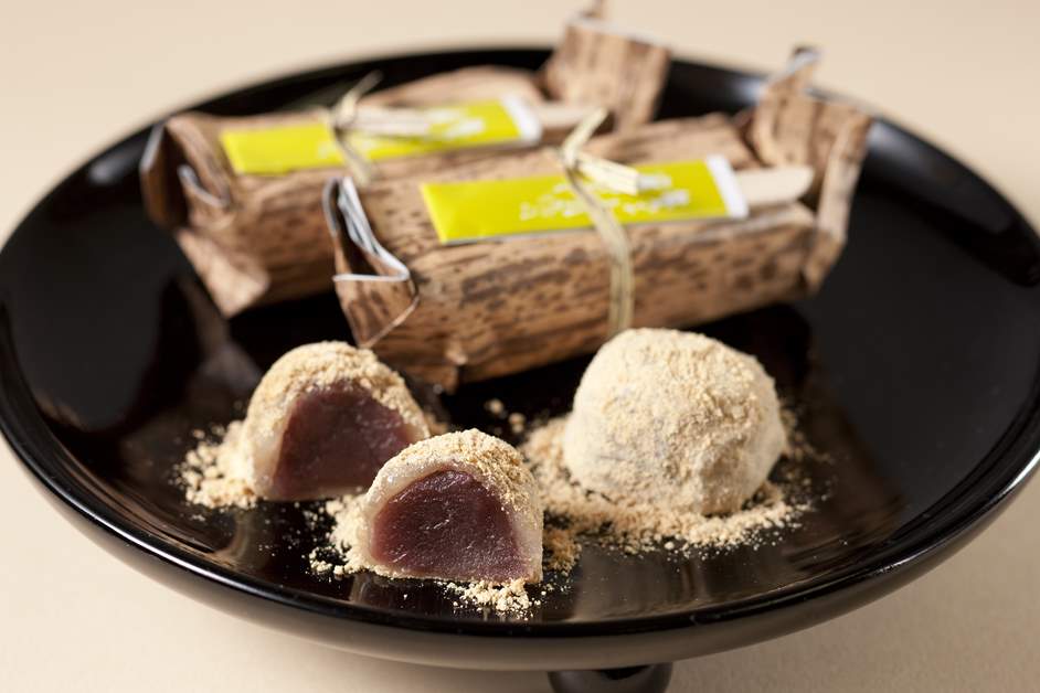 在小包袱布上摊开里面吃是赤坂年糕的风格。柔软的年糕中含有黑糖,在醇厚的甜味中,核桃的香味更为突出。和大量包裹的黄豆粉作为搭配自不必说是最佳搭配。