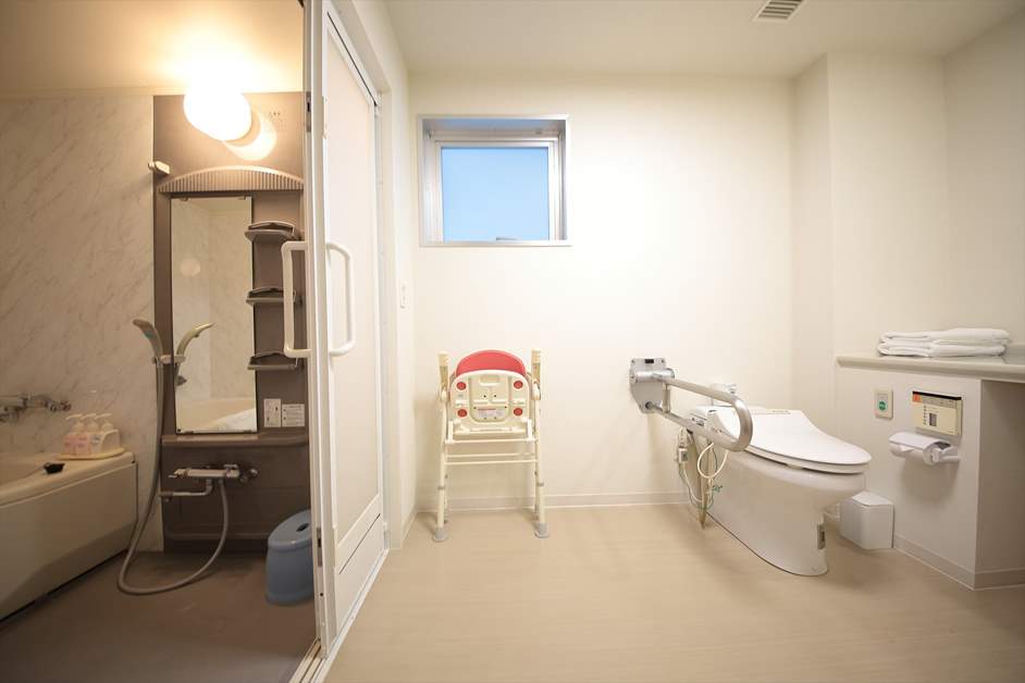 在无障碍设施中,设置了考虑到为老年人和轮椅使用者的通用双人房。入口宽敞,滑动门的浴室·厕所都有扶手,谁都可以放心地住在酒店里。酒店里也有多功能厕所,还准备了供轮椅使用者使用的停车场。整个建筑,包括入口处,整个酒店通道都很明亮,步行也可以很安心。