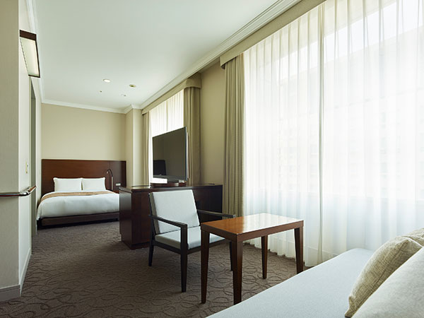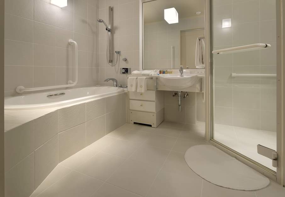 在总共278间客房中,普通楼层的中等双人房和特别楼层“Premier楼层”的Premier双人房的一部分是通用房间。通往浴室的门是拉门,在洗脸盆下面设置了一个宽敞的空间。壁橱的衣架杆的高度可以调整等,都是有考虑到轮椅使用者的设计。浴缸,厕所都有扶手,老年人也可以放心。