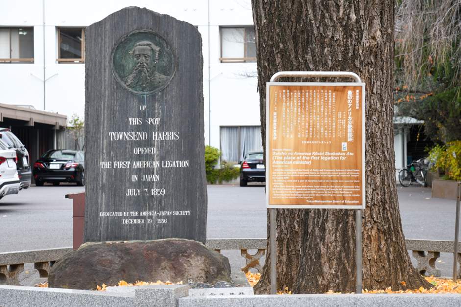 由于在日本历史上被称为“黑船来航”的马修·佩里提督访日,1854年日美和亲条约缔结后,从1859年到1875年,在善福寺设置了第一代美国公使馆。院内立着第一代美国公使汤森特·哈里斯的石碑,传达着历史。