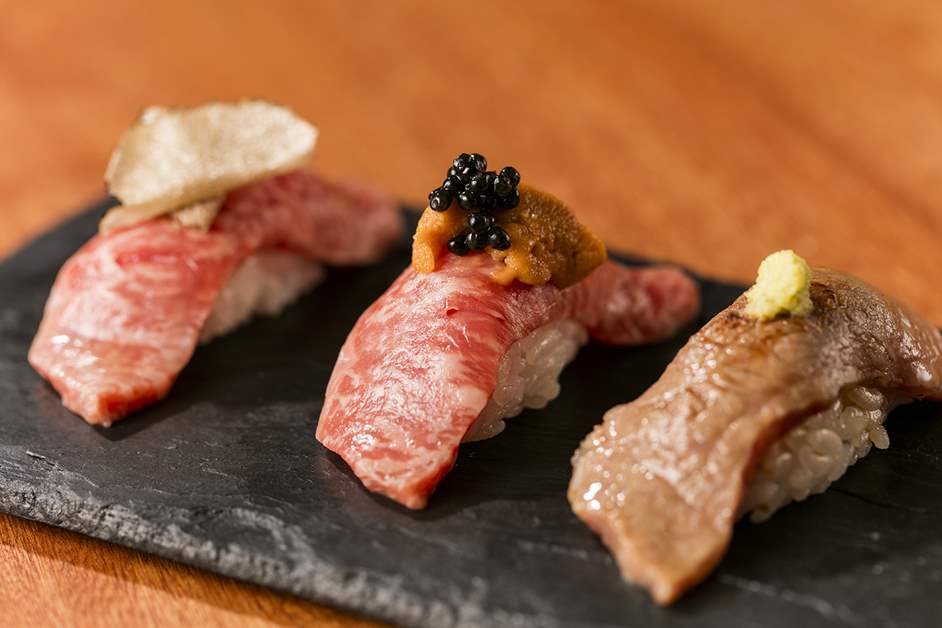 牛肉寿司的种类也很丰富。白汤的海带汁和烤米粉等,像烤肉一样按部位准备。除此之外,还有与云丹、鱼子酱等高级食材组合而成的奢侈牛肉寿司。试着用拼盘来比较,感受一下奢侈的心情。