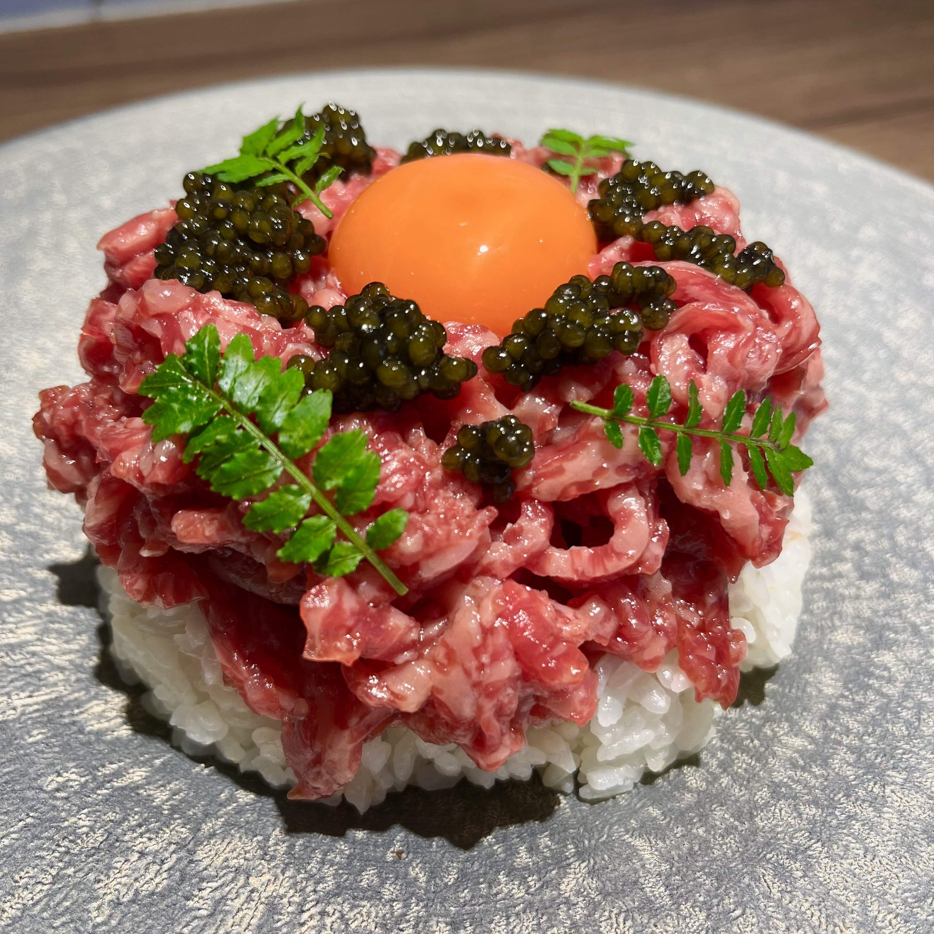 这是一种奢侈地将黑毛和牛比作耀眼的盖饭。黑毛和牛在高温下烤1分钟左右,浇上秘传的酱汁和米饭一起吃。为了享受黑毛和牛融化的口感和优质脂肪的美味,推荐一开始就简单地保持原样,第二口以后和佐料一起,最后用鲣鱼和海带精心制作的清澈汤汁,清爽地吃。继续吃的话,因为米饭里藏着黑毛和牛,所以到最后都能充分享受肉的味道。