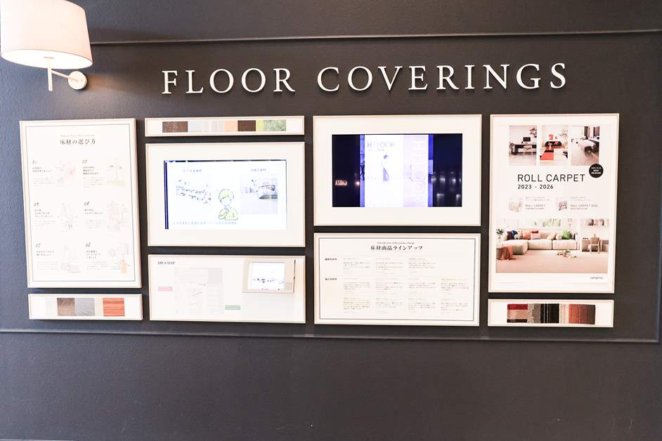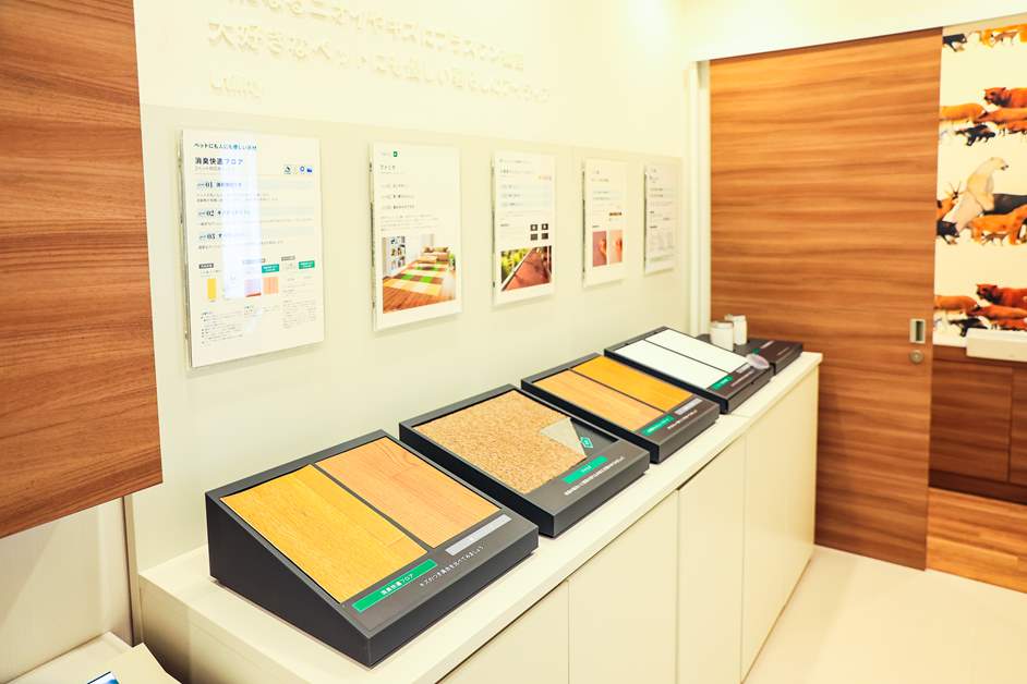 展示厅内还设有可测试功能性商品的实验区。如仅轻轻一擦就能清除污垢的壁纸、以及地板材料的耐久性和除臭功能等,可实际进行尝试是展示厅特有的优势。