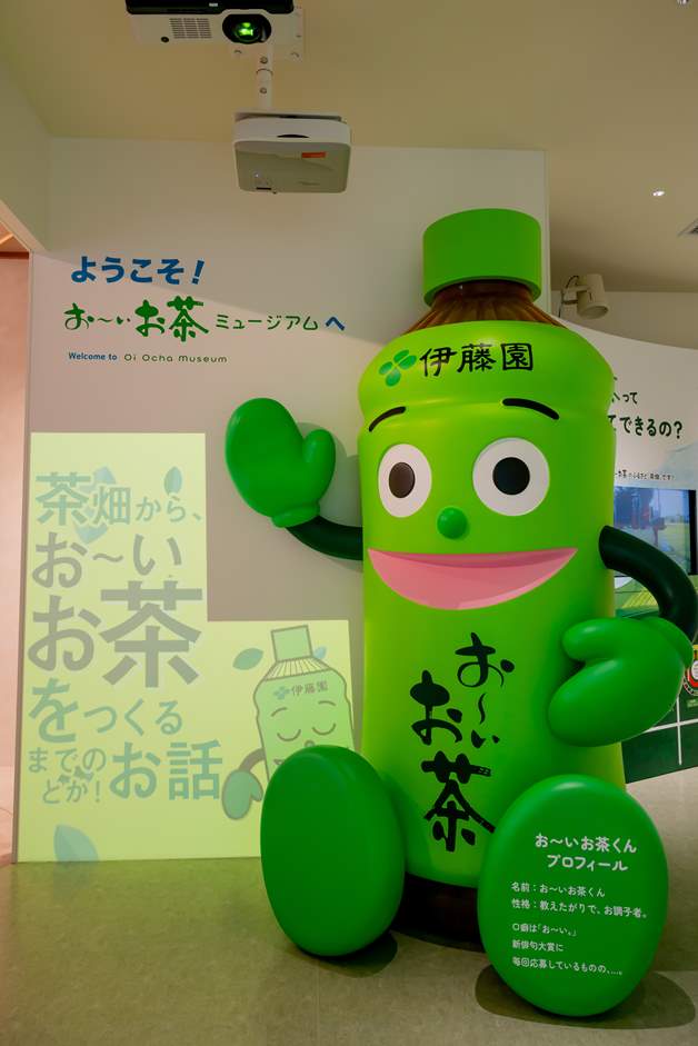 包夹着中央入口、位于“茶的文化创造博物馆”旁边的“Oi Ocha 博物馆”,是介绍伊藤园主力商品“Oi Ocha”发展历程的博物馆。入口处迎接游客的是吉祥物 Oi Ocha 小子。“Oi Ocha 博物馆”的小原武秀馆长带领我参观了这里。