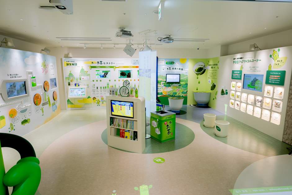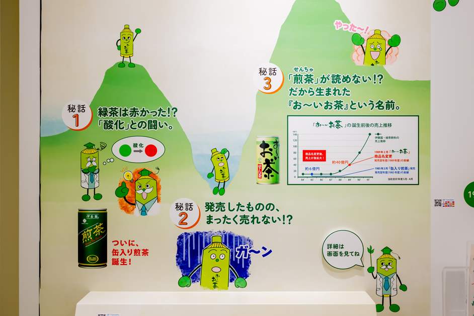 这里设有以插画或影像的形式介绍“Oi Ocha”好喝秘密的“Oi Ocha 的制作过程”、介绍开始销售之前所经历流程的“起起伏伏的诞生秘闻”等展区,可以让人加深对 Oi Ocha 的了解。“商品名称 Oi Ocha,取自演员岛田正吾先生在 1970 年代的罐装煎茶广告中喊出的‘Oi Ocha’的广告词”(小原馆长)