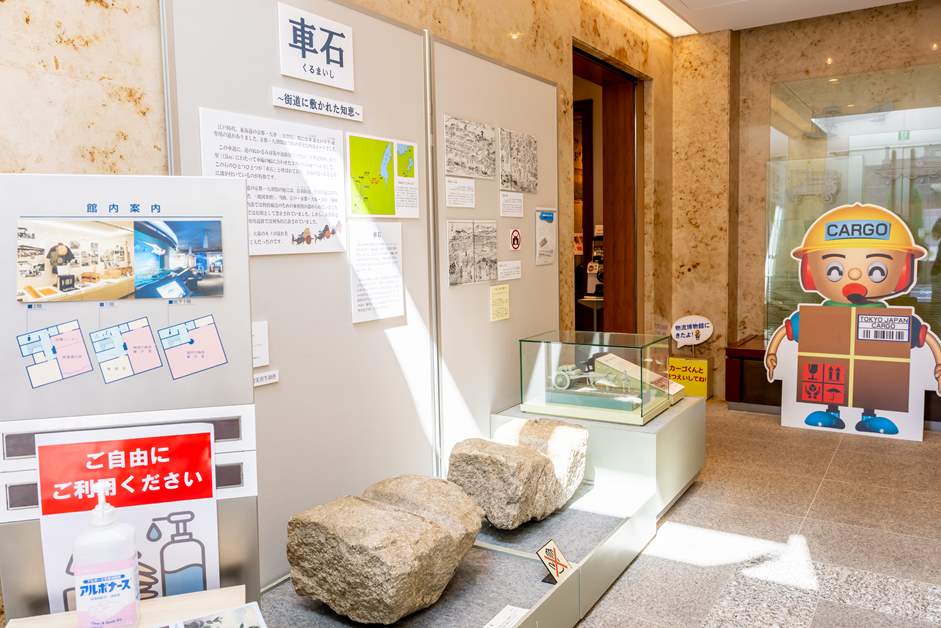 一进入馆内,吉祥物“货物君”(Cargo-kun)便会前来迎接。 1楼接待处前展示着巨大的“车石”,这是江户时代铺设在牛车专用道上的石头,上面有与车轮同宽的凹槽,如同下凹的轨道一般。 据说,为了防止道路泥泞、保护路面,东海道上从京都到大津约12公里的路段都铺设了“车石”。