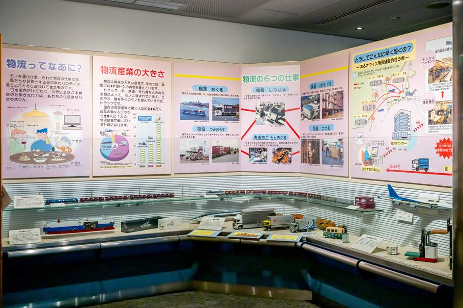 在地下1楼的“现代物流”展厅,可以接触到不断发展的物流产业的“当下”。 日本国内约有236万人从事物流行业,每年运送约42亿吨(2022年度)的货物。