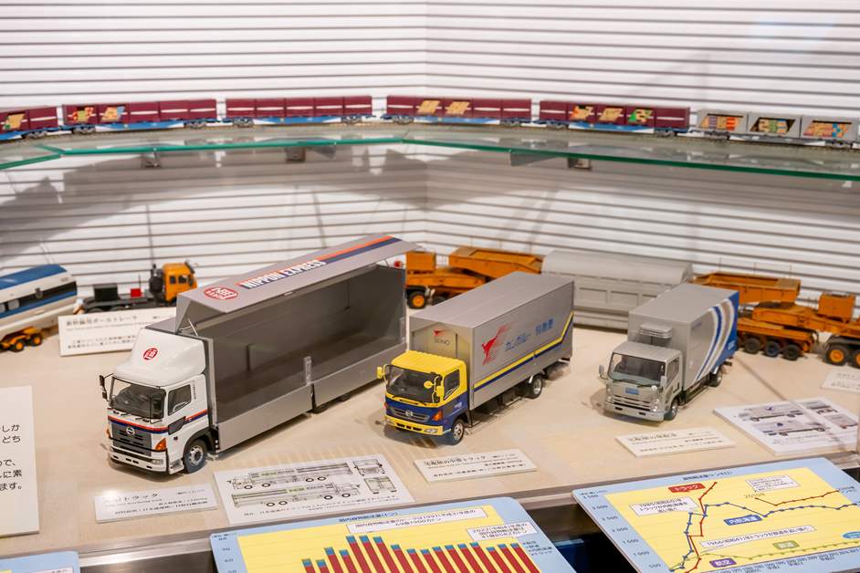 作为物流关键环节之一的卡车模型。 模型按1/25的比例制作,并排展示着快递收派车、快递中型卡车和大型卡车三种。 据说这些模型出自专业模型师之手,细节之处也制作得十分考究。