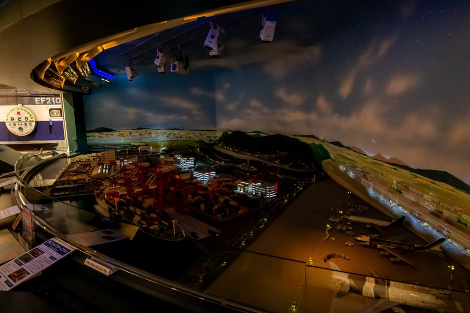 立体模型用大约4分30秒再现了一天24小时。 即使到了夜晚,铁路和卡车也持续运行,让人清楚地了解到物流是24小时不间断的。
