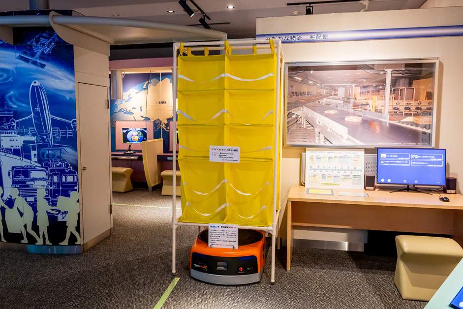 网上购物是现代生活中不可或缺的一部分。这里还展示了在网购物流中心大显身手的机器人。 被称为“Drive”的机器人会抬起并运送装有商品的、被称为“Pod”的货架。 “在亚马逊日本(Amazon Japan G.K.)的协助下,我们展出了一个等比例的模型。 以前,物流中心的仓库需要作业人员手动从货架上取货,但引进机器人后,就可以自动分拣商品了。 作业人员无需再在仓库里四处走动寻找商品。”(小绿先生说)