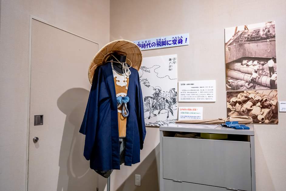 影像展厅的一角还有一个可以变身为江户时代“町飞脚”(民间快递员)的区域。 这里重现了负责运送货物的“宰领”(运输负责人)的服装。