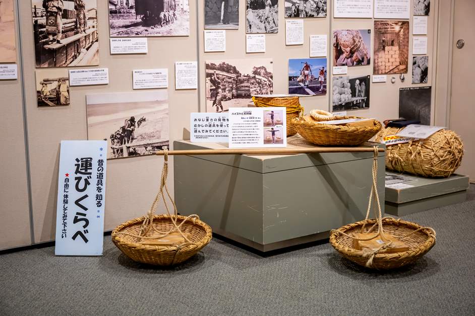 这是一种被称为“Paisuke”的篮筐和扁担(前景),用于搬运土方或煤炭。 这是对当时在港口从船上卸煤等作业中所用工具的复制。 可以体验搬运包括“Paisuke”和扁担在内总重13.6公斤的货物。 要掌握平衡出乎意料地困难。