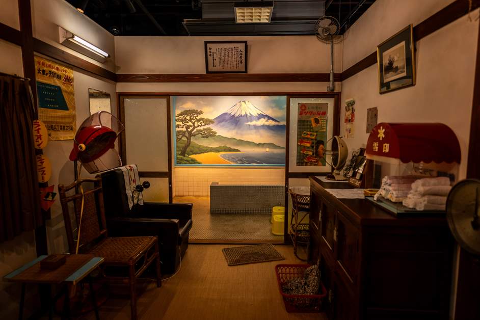 墙上绘有富士山的老式公共澡堂里,摆放着如今已不多见的头罩式吹风机和古董按摩椅等物品 。