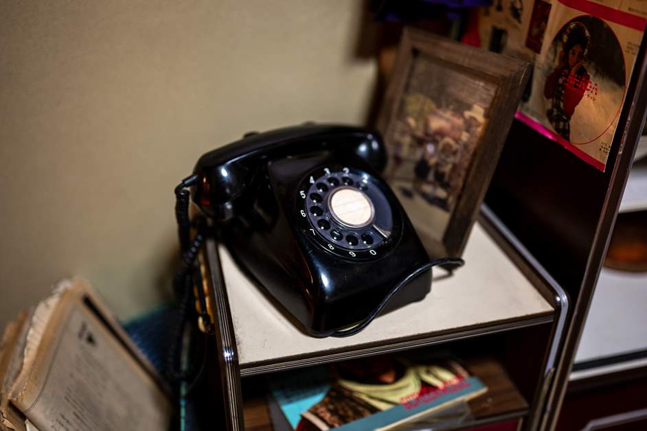 放在餐厨一角的黑色电话机是圆盘拨号式固定电话 。拨打电话时,需要将手指伸入数字孔中转动,然后松手让其归位,重复这个动作来输入电话号码 。