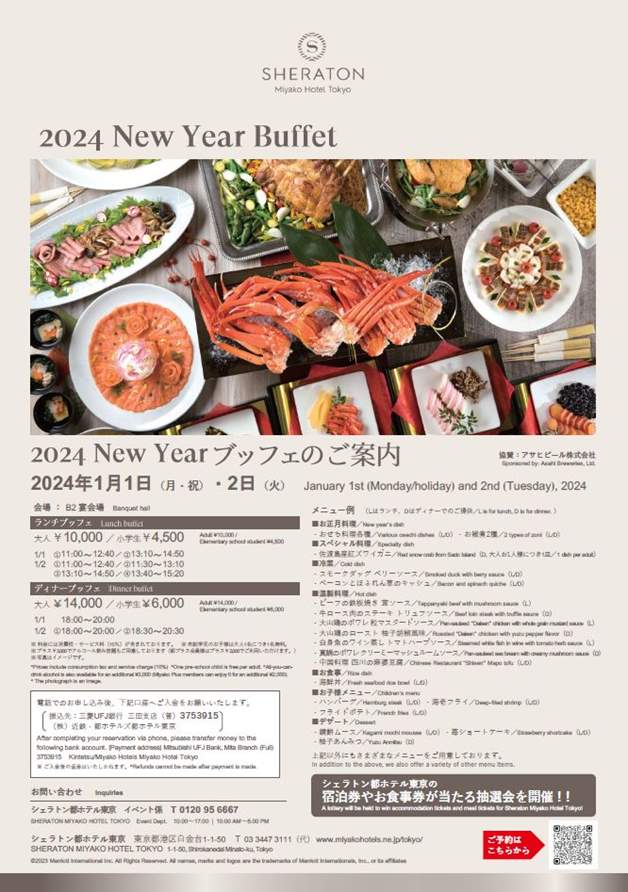 东京喜来登都酒店将于 2024 年 1 月 1 日(星期一)和 1 月 2 日(星期二)举办为期两天的“2024 年新年自助餐”。 为了适应新年,我们将准备各种可供家庭三代人享用的菜肴。 在这道自助餐中,您可以享用庆祝新年的“osechi cuisine”和“ozoni”,在您面前完成的铁板烧和海鲜碗,以及刺激五种感官的“中国菜四川”的麻婆豆腐。 在自助晚餐中,我们将为每位成人提供一盘来自佐渡岛的红雪蟹。