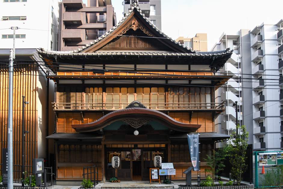 這棟東京都內唯一現存的木造藝妓管理所,其建築外觀氣勢宏偉,自然而然地吸引過往行人駐足,尤其以歇山式屋頂的屋簷裝飾和玄關的唐破風蔚為特色;乍看下像是傳統日本建築,實則融合了西洋的建築技術和精心構思的設計,因此也被稱之為「近代和風建築」。