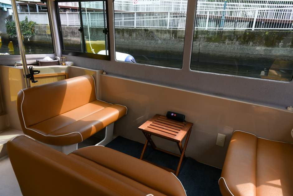 可乘坐8人的快艇,除了設有沙發座椅的舒適船艙外,還可以到甲板享受更加清爽的景色。有乘客用的插座,晚上還可以調節照明,工作人員井上表示:"乘坐一次後,很多人期待下次會和誰一起使用,真是太高興了。租車的最大優點是,可以不用在意周圍的人。帶着孩子一起到水邊的餐廳作爲移動手段使用,帶食物或點心,以少數人一起享受水上野餐,外出或同學會等活動、企業研修或海外顧客接待的口號使用的情況也在增加。"攜帶食物也OK,出生1年以上的小狗可以在領帶上上船,所以最近作爲狗友好的休閒活動人氣也越來越高。而且暖氣完備,冬天也很舒適。還有衛生間,萬一發生意外也放心。