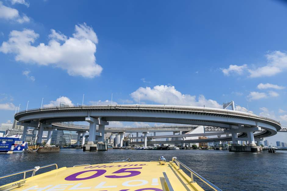 從這裏開始,比在街道上前進的剛纔更加開放的景色。視野中可以看到以臺場側的街道爲背景的彩虹橋的全景畫。船先從那裏向左移動,然後駛向連接彩虹橋的環橋。從正下方可以觀賞到作爲拍照區人氣極高的環橋也是一次特別的體驗,同時還可以觀賞到觀光船無法進入的區域也是一次特別的活動。