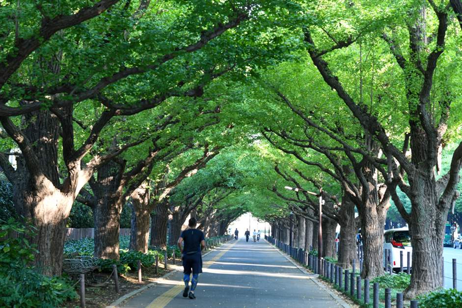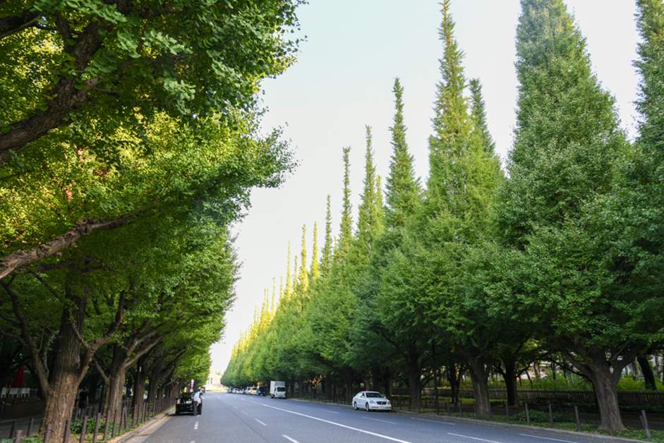 然後在「青山二丁目路口」下車後,在眼前能看到在港區有代表性的名勝之一,「明治神宮外苑銀杏林蔭」。在成為綠色拱形的步道上,整天可以看到跑步或溜狗的人。