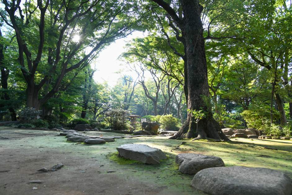 沿著青山街看望的話,雖然是附設玩具或長凳的看起來普通的公園,但是一進去裡面,有架石橋的池塘,而展開散佈石燈籠或石碑的日式庭園的景色。
