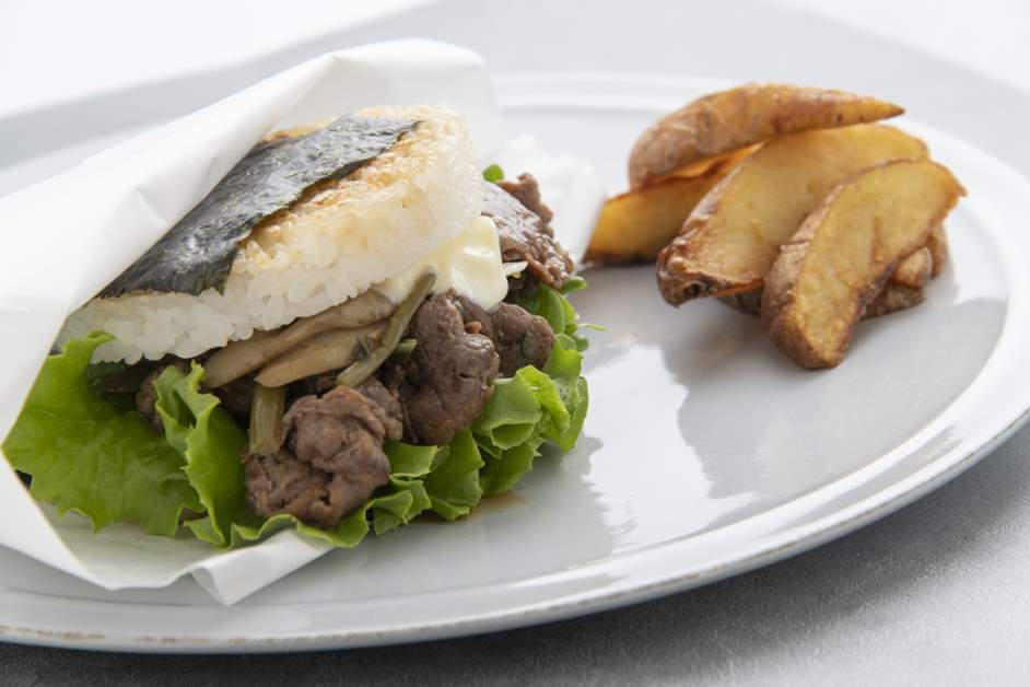 使用新商品“若狹牛”製作的米漢堡,肉質軟嫩多汁,是一款能讓人品味奢華的至尊米漢堡。