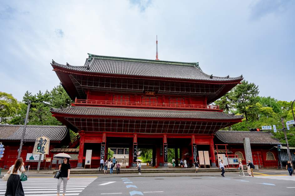 位於港區芝公園的增上寺,以德川將軍家的菩提寺而聞名。 1590年(天正18年),家康公與當時增上寺的住持源譽存應上人結下善緣,從而使其成為江戶的菩提寺。日比谷大道沿線的三解脫門是增上寺的入口,同時也是其像徵。朱紅色的三解脫門作為增上寺的正門,於1611年(慶長16年)由德川幕府資助,並由幕府大工頭——中井正清攜屬下共同建造。現在的門則是在1622年(元和8年)重建的。