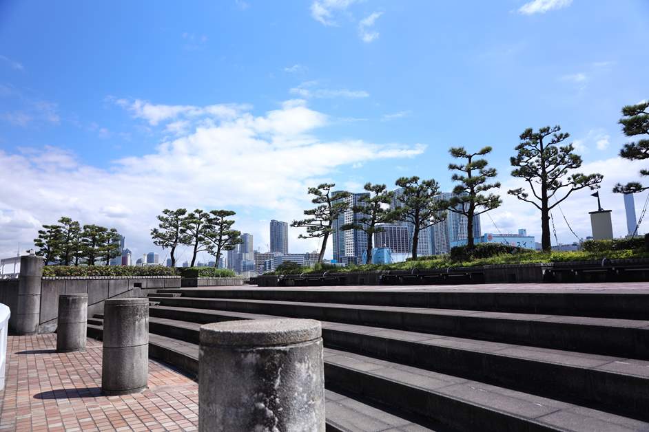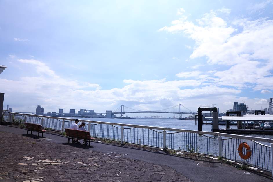 穿過南區後,就來到了竹芝小型船碼頭候船廣場。 雖然位置比海濱漫步棧道低一些,但也能欣賞到彩虹大橋和台場的景色,正是一處隱藏景點。