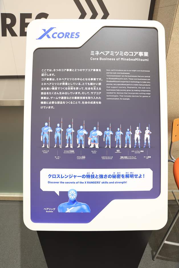 X-RANGERS是美蓓亞三美集團8大核心業務“軸承”“電機”“模擬半導體”“零件產品”“感測器”“連接器/開關”“電源”“無線/通訊/軟體”,副核心 業務“智慧型手機關聯產品”“遊戲關聯產品”,總計10個業務為主題設計的戰隊英雄風格的角色形象,它們也是博物館的吉祥物,深受孩子和海外人士的歡迎。