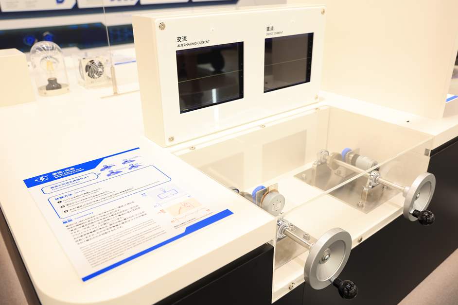 在「電氣/電子」展位轉動設備的搖柄體驗發電過程,請親自嘗試一下吧,觀察「交流電」和「直流電」的差異。