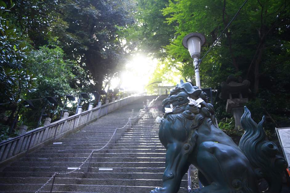 石階前守護參拜者的狛犬(類似中國的石獅子),非常上鏡。如何將它們與石階結合起來,以及從哪個角度拍攝它們,都非常考驗攝影師的能力。這個鬱鬱蔥蔥的、可以欣賞到四季風景的愛宕神社,在不同時段氛圍也是不同的。