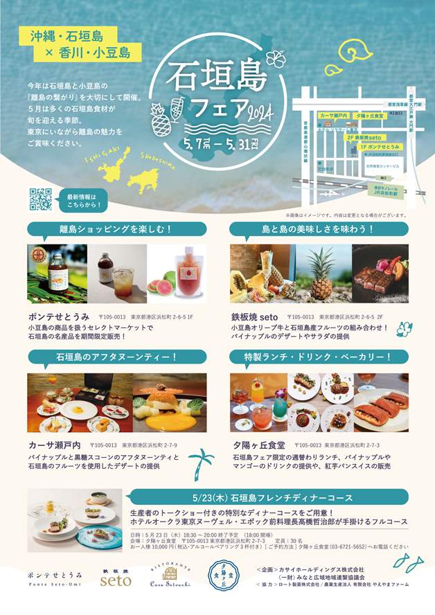 我們很高興地宣佈,「石垣島博覽會 2024」將於 2024 年 5 月 7 日(週二)~ 31 日(週五)期間在每家 Kasai Holdings 商店舉行。今年,我們將珍惜石垣島和小豆島之間的“偏遠島嶼之間的聯繫”,並將舉辦比去年更多的商店的活動。五月是石垣島許多食材的季節。 這是一個在東京逗留期間可以享受偏遠島嶼魅力的活動。