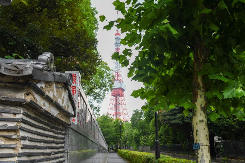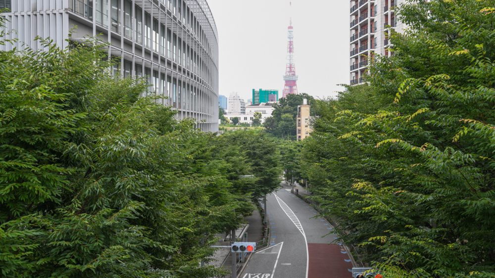 It's early morning, before the streets of Roppongi awaken. Descending the wood-lined slope, I feel a refreshing breeze, and I catch a glimpse of Tokyo Tower standing tall in front of me, as if it were poking through the sky. From there, I take a back road and run down Sakura-zaka, a gently-curved hill, toward Azabu Juban.