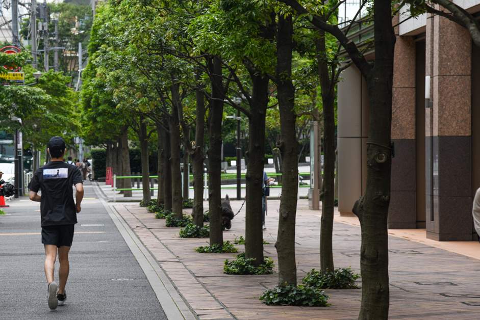 The terrain slopes gently downhill until Azabu Juban, where the road becomes flatter and flatter. After passing the Ichinobashi Bridge, which stands over the Furukawa River that flows from Shibuya, I enter the streets of Mita, which are lined with office buildings. The sidewalks here are wide and easy to run!