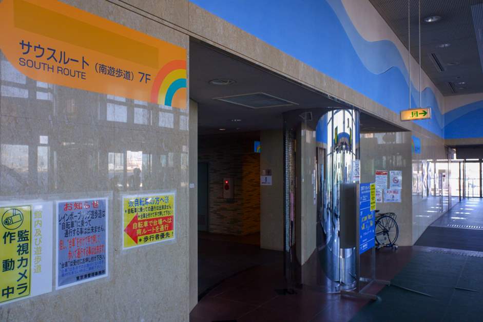 You can take the elevator from Shibaura Pier to the promenade on the bridge. Admission is free. Rainbow Bridge has two pedestrian walkways: the North Route (on the Shibaura side) and the South Route (on the Tokyo Bay side).