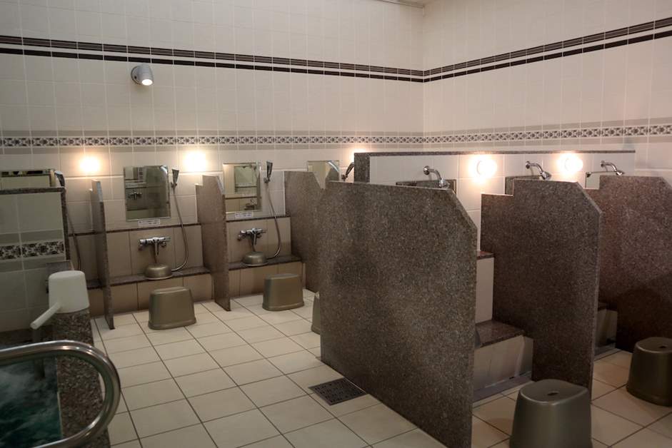 Appropriate bathing time is 5 to 10 minutes for hot water and about 20 minutes for warm water. The standard time is about the amount of sweat coming out of the forehead. After you are well warmed up, wash your body in the washroom. Many kalans have separate hot and cold water, so adjust the hot water in the tub as you use it. When showering, make sure that the hot water does not splash onto the person next to you.