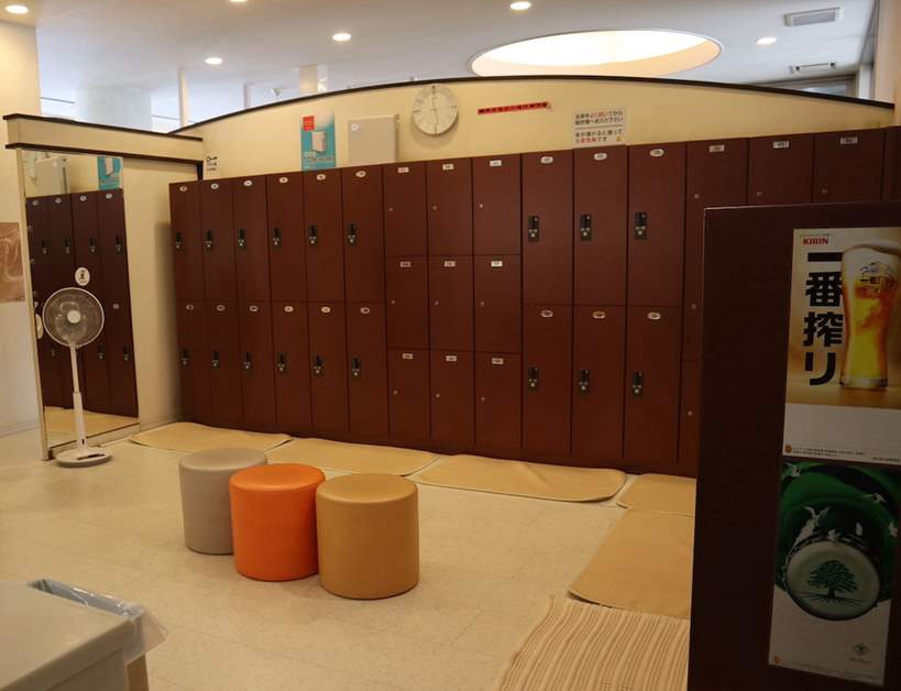 After passing through the door of the men's or women's bath, take off your clothes in the changing room. Bathing with pants on or in a bathing suit is not allowed. Take off all of your clothes. After placing your clothes and luggage in the locker, be sure to lock the lock and wrap the key around your wrist before going to the bathroom.