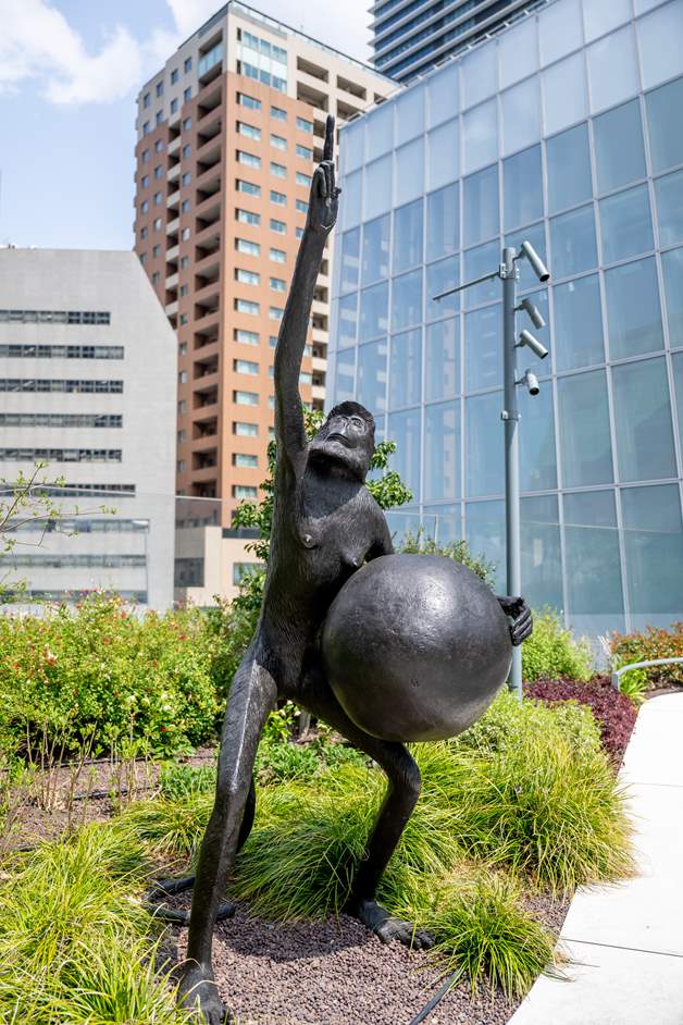 The T-Deck also features public art, such as Matter by sculptor N.S. Harsha—a piece depicting a monkey holding the Earth and pointing to the sky, as if synchronizing with the Toranomon Hills group of buildings. It invites visitors to contemplate the future of humanity in this cutting-edge space while reflecting on the history of the Earth.