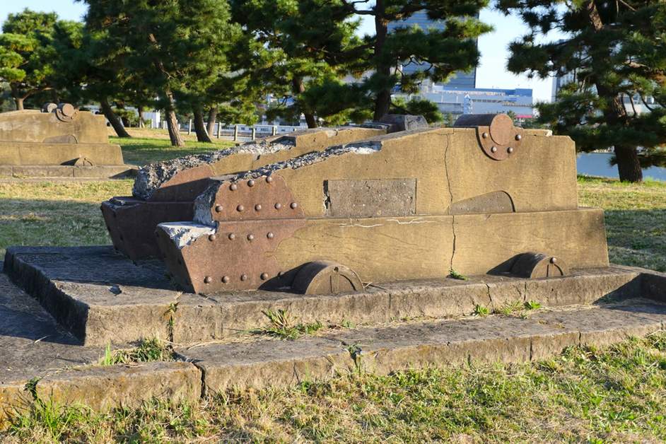 400年近く続いた江戸幕府の「鎖国」の間は、日本は限定的な外交と外国との貿易しか行いませんでした。そこで1853年6月3日、アメリカからペリー艦隊が来航し、幕府に開国要求を迫りました。これに脅威を感じた幕府は、海上砲台を建設しました。計画では11つの台場を作る予定でしたが、1868年に幕府が崩壊し、最終的に完成したのは5つだけです。現在、東京湾に未だに残っているのは第三台場と第六台場だけです。